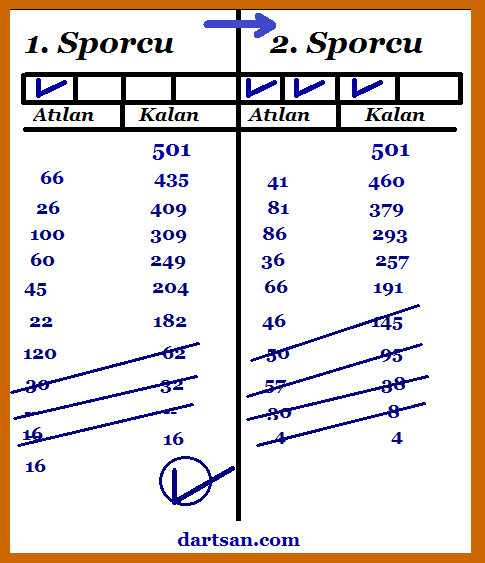 | Yazıcı, yazı tahtasında atış önceliğini kazanan sporcunun isminin olduğu haneye kalem ile ok işareti yapar. Her sporcu sırayla üç oku dart tahtasına atmaya başlar. porcunun her üç atış sonrası aldığı toplam puanı onun sayı hanesinden sıfıra doğru eksilecek şekilde yazmaya başlar. (Mesela; genç ve büyüklerde 501 den itibaren geriye doğru sıfır rakamına (double out: iki katı bitiş kuralı ile) ilk ulaşan bu ilk LEG'i almış olur. (LEG: Bir maç süresince oynanan her bir yarışma etabı yada diğer adı ile set) İkinci lege başlarken bu kez 1. Legde atış yapan değil, diğer sporcu ilk atış yapma hakkına sahiptir. Her legde ilk atış hakkı diğer sporcuya geçer. Bu legler sonunda müsabaka kuralına göre 3 veya 4 legi alan sporcu maçı kazanmış olur.Maçı kazanan sporcu bir sonraki tur eşleşmesini bekler. Maçı kaybeden sporcu, teknik heyetin belirlediği bir sonraki maçta yazıcı olarak görev alır. | ![]() |